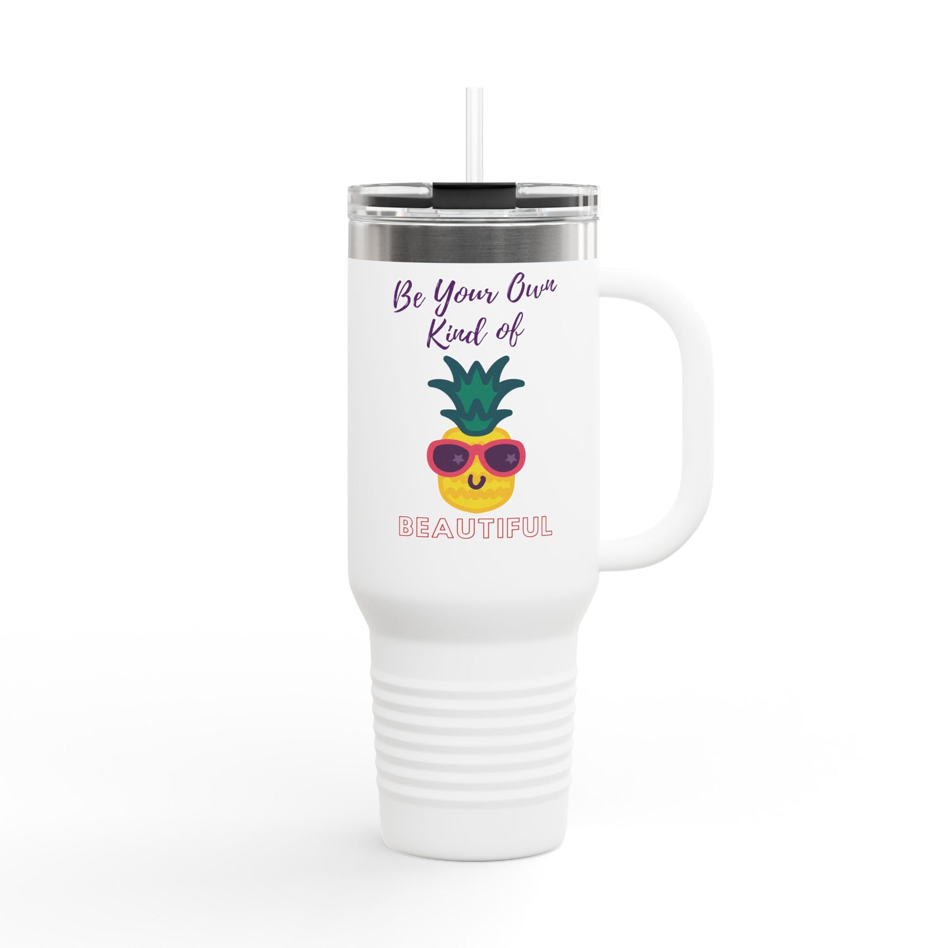 Stay stylish and inspired with our 40oz insulated tumbler featuring the uplifting phrase Be Your Own Kind of Beautiful and a fun, quirky design of a pineapple wearing glasses. Perfect for brightening your day, this tumbler is as functional as it is fashionable!