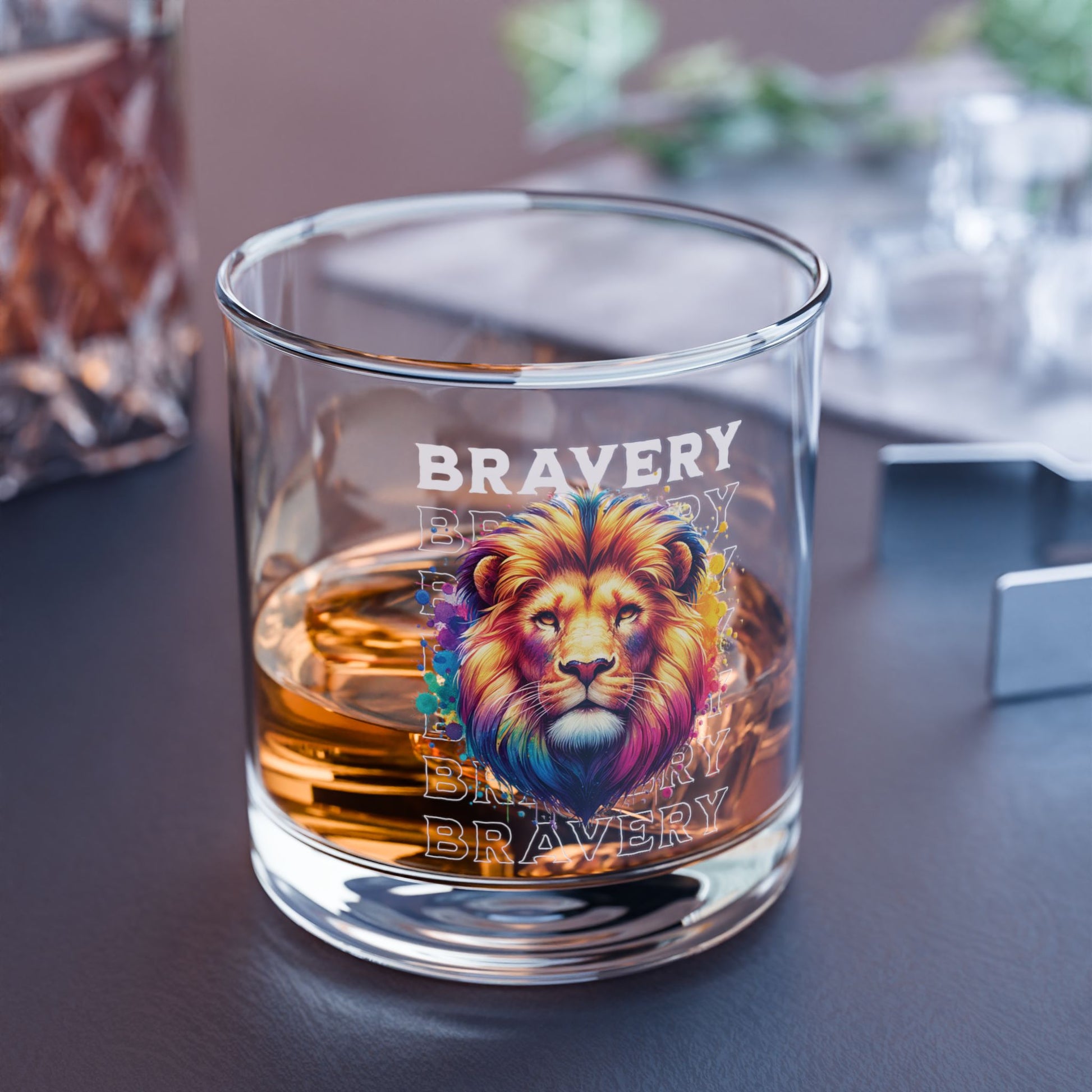 Unleash your courage with our 10oz Bravery Rocks Glass, where bold design meets lasting durability. Featuring the word Bravery etched in striking typography and overlaid with a majestic lion illustration, this glass is a tribute to inner strength and fearless style. Crafted from clear tempered glass, it’s built to impress and endure.